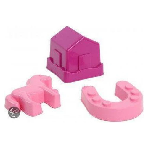 Set van 3 vormpjes voor in de zandbak of het zwembad. De zandvormpjes zijn roze van kleur en hebben het thema Paarden. 3 vormpjes: paard, hoefijzer en stal.