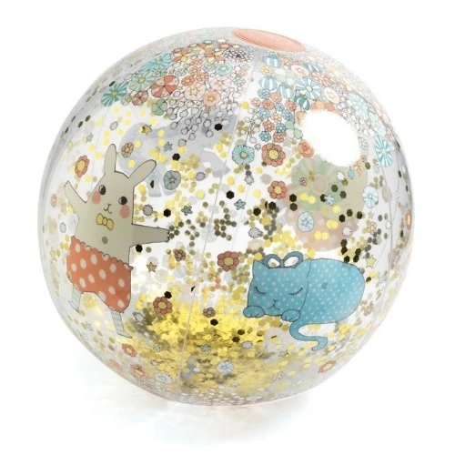 Een mooie doorzichtige bal met glitters met mooie afbeeldingen erop van het merk Djeco.
