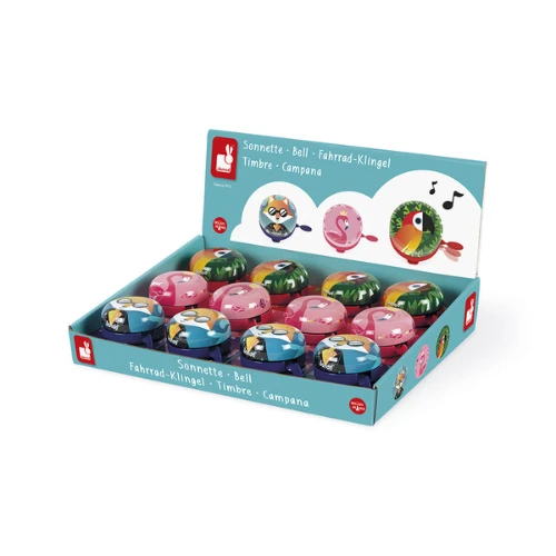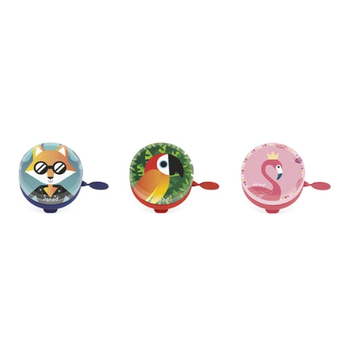 Metalen bellen in drie verschillende modellen – Beauty (met de roze flamingo), Biker Club (met de vos) en Jungle (met de papegaai) geschikt voor alle soorten rijwielen (metalen ring voor bevestiging rond het stuur).