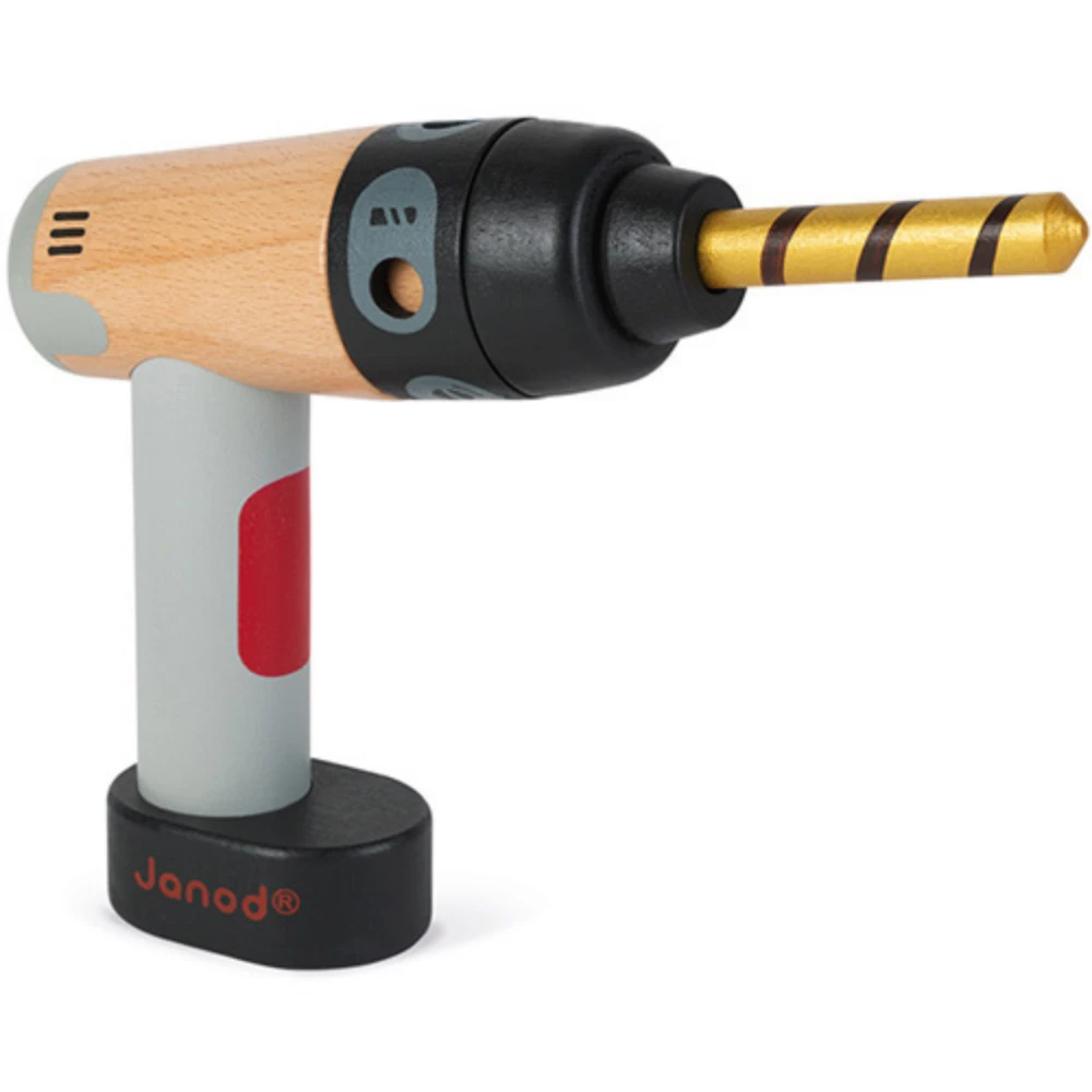 Bouwen – Brico’kids, Boormachine is een houten boormachine waarvan de boor en schroevendraaier magnetisch zijn en die je om en om op de boormachine kan doen van het merk Janod. Zo kan de kleine bouwvakker helpen met klussen en zelfs het middenstuk draait. Dus het is net echt.