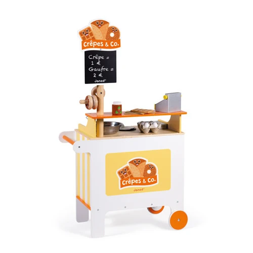 Om lekkere pannenkoeken te kunnen maken heb je de eenvoudig te verplaatsen stand Crêpes & Co en zijn 40 accessoires nodig: 1 kassa, 1 set met muntstukken en bankbiljetten, 1 wafelijzer, 3 wafels, 3 donuts, 1 doos met 4 eieren, 1 pot met chocoladepasta, 3 pannenkoeken, 3 toppings voor pannenkoeken, 1 kom, 1 garde, 1 beslagspreider, 9 fruitschijven, 1 tang, 3 zakjes van kraftpapier, 2 kartonnen voedingsdozen en 1 doosje met krijt.