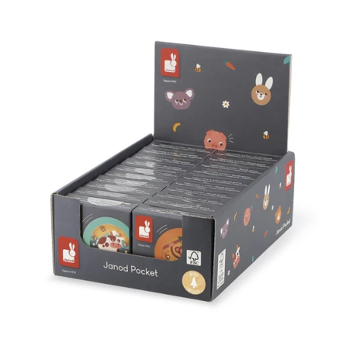 Mini-kogelspelletje. Verschillende dieren: Koala, konijn, aap en koe. Het kind dient geduld en handigheid te gebruiken om de 5 metalen kogeltjes in hun gat te krijgen. FSC-gecertificeerd.