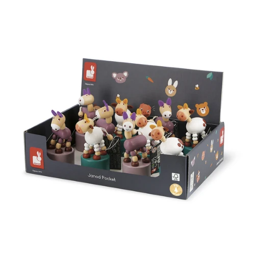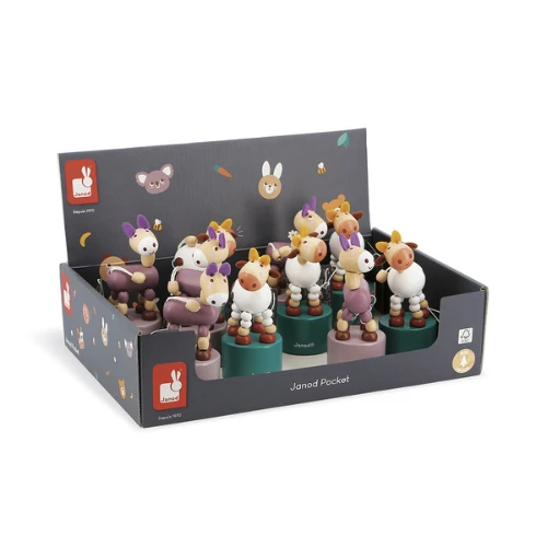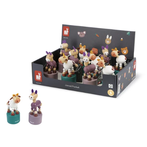 Drukfiguren: 5 koeien + 5 ezels. Het kind duwt met de vingers de veer onderaan de sokkel in en vermaakt zich met het laten bewegen van het dier, dat in alle richtingen begint te draaien. De oren van het dier zijn van vilt. FSC-gecertificeerd.