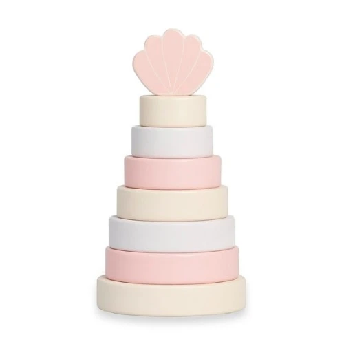 Een mooie roze houten stapeltoren met een schelp bovenop van het merk Jollein. Heerlijk om je kind te laten bouwen.