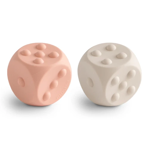 Set van 2 siliconen dobbelstenen ‘Dice Press Toy – Blush/Shifting Sands’ van het merk Mushie om mee te dobbelen en mee te spelen.
