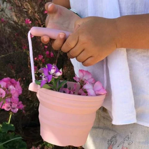 Set bestaande uit een plooi emmertje en schepje van het merk Scrunch in de kleur Oud roze. De emmer vouw je eenvoudig in elkaar tot een plat item, waardoor die zeer geschikt is om mee te nemen. Kan gebruikt worden in zowel de zandbak als het zwembad.