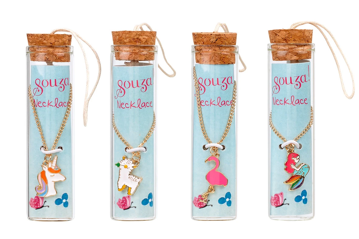 Mooie ketting van het merk Souza in een leuke flessen verpakking. De ketting is goudkleurig en heeft een bedel van een eenhoorn, schaapje, flamingo of zeemeermin.