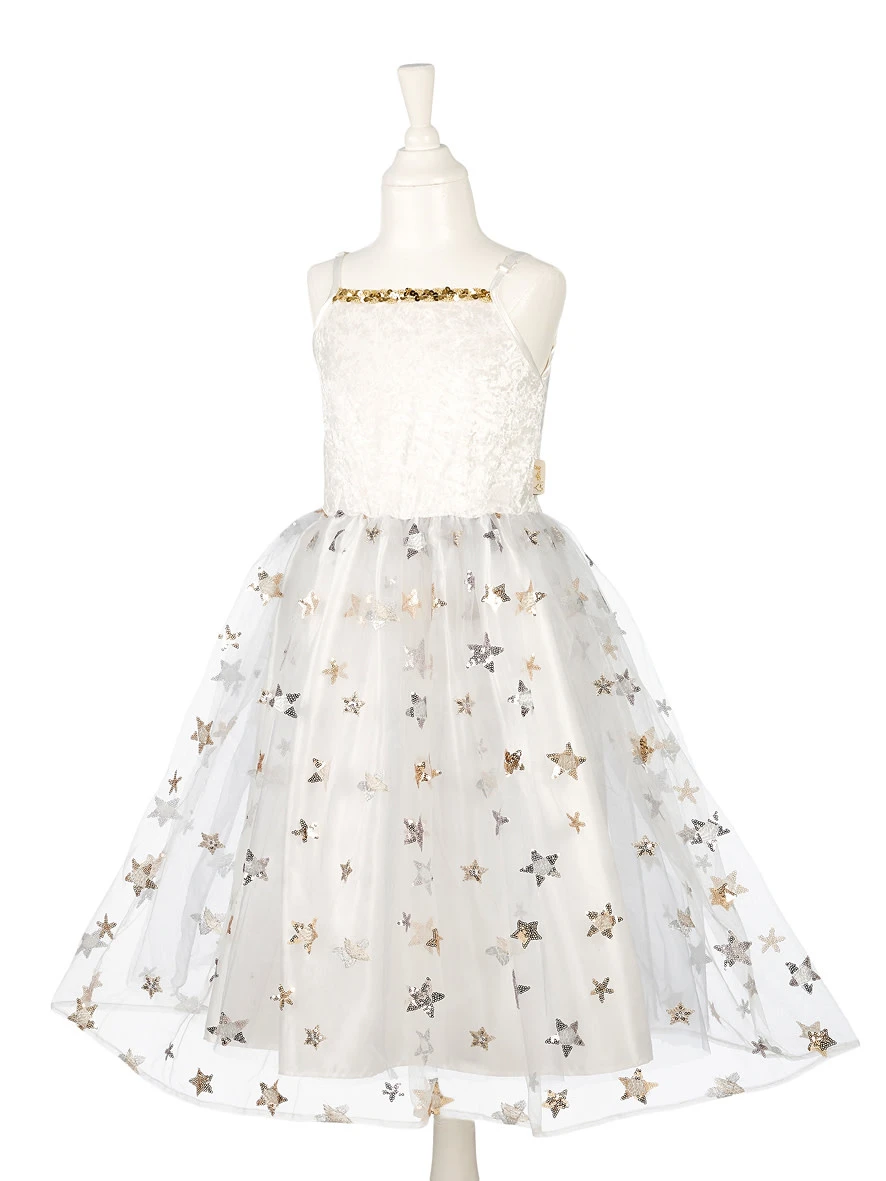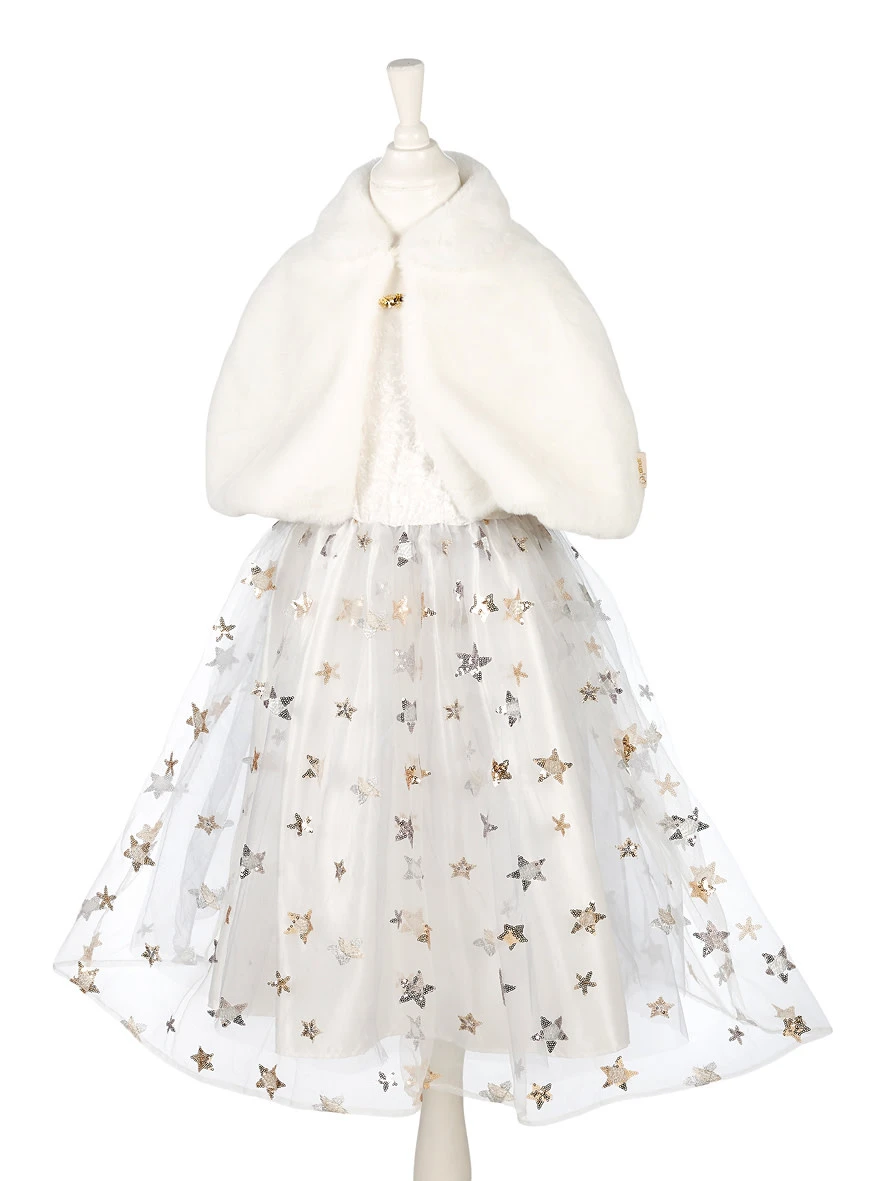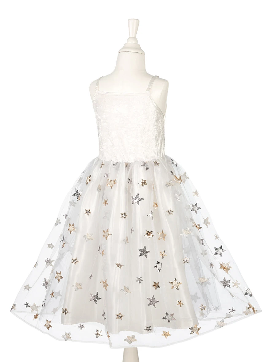 Prachtige winterse prinsessen verkleed jurk van het merk Souza! De rok van de jurk is afgewerkt met tule en glinsterende sterren. Combineer met wit bontje om de outfit compleet te maken. Jouw kleintje is dan zeker weten de mooiste winterprinses op het bal.