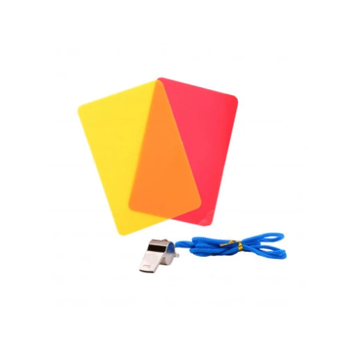 Speelset voor kinderen bestaande uit een rode kaart, gele kaart en scheidsrechters fluit. Fluit een wedstrijd als een ‘echte’ scheidsrechter en deel als het moet een rode of gele kaart uit. Met deze set verkleed jij je eenvoudig tot een scheidsrechter.