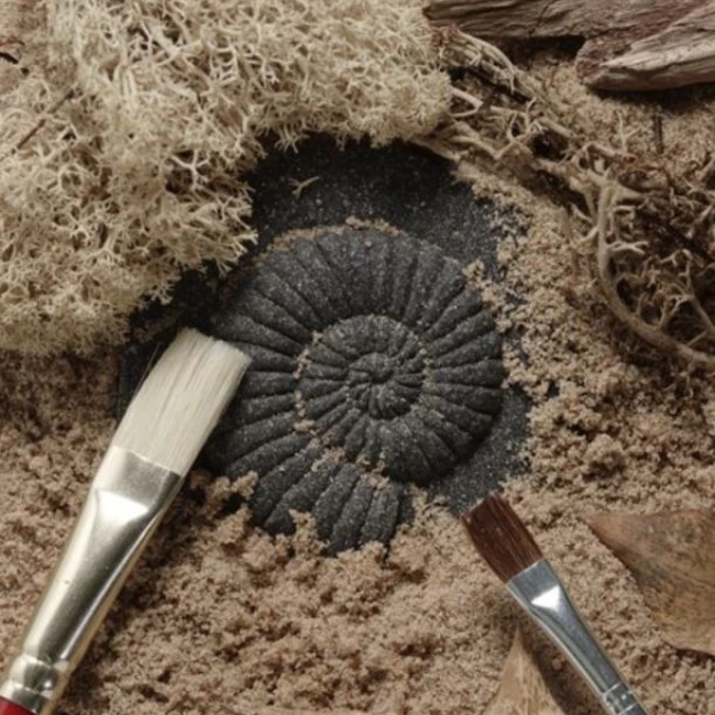 Ga op fossielenjacht, ontdek ze buiten begraven of in een zandbak, graaf ze op en maak ze schoon. Leg vast wat er is gevonden door een was te wrijven en/of een fossiele afdruk te maken in boetseerklei.